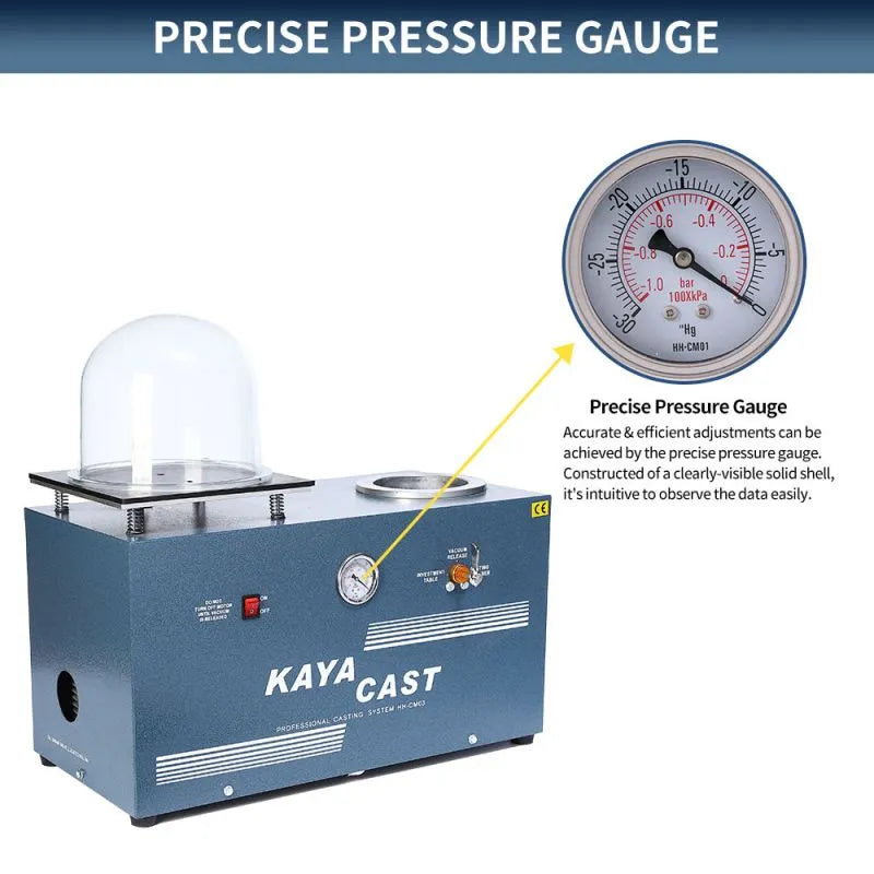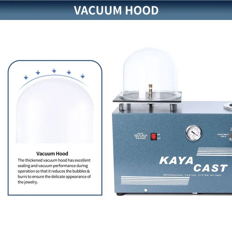 The vacuum hood, with its thickened structure, is specifically designed to offer exceptional sealing and superior vacuum performance during operation. This feature minimizes the occurrence of bubbles and burrs in the casting process, ensuring the delicate appearance and quality of the final jewelry pieces. Its robust build provides an effective vacuum environment, significantly reducing imperfections to deliver high-quality, flawless jewelry creations.