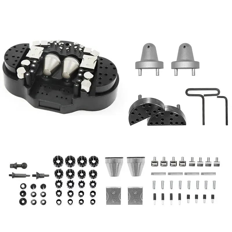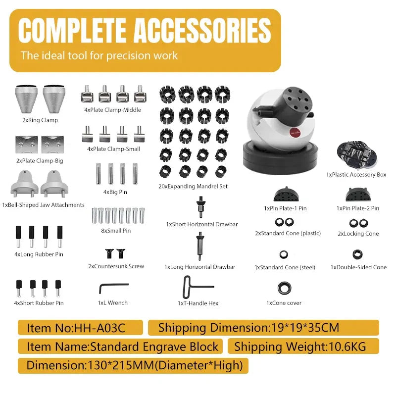 Full set ball vise for engraving, equipped with a hexagonal wrench to adjust the distance between the jaws; a variety of pins and accessories are provided for easy manual work.