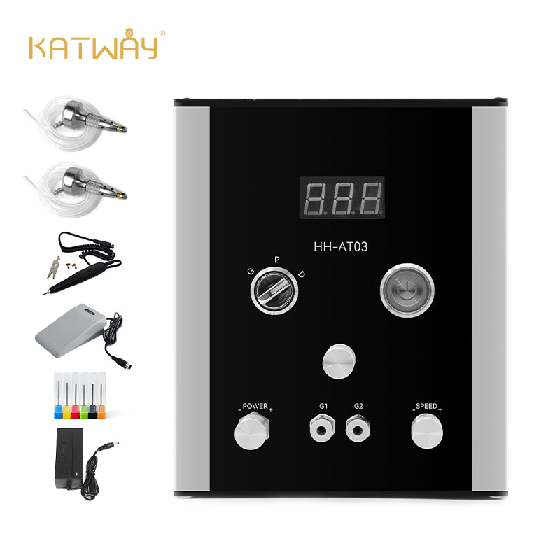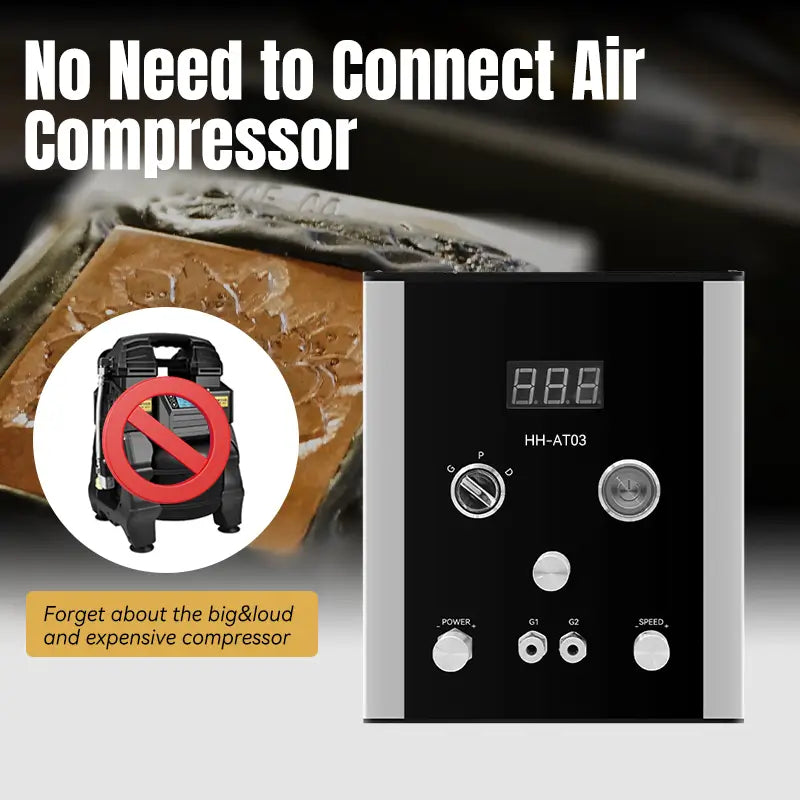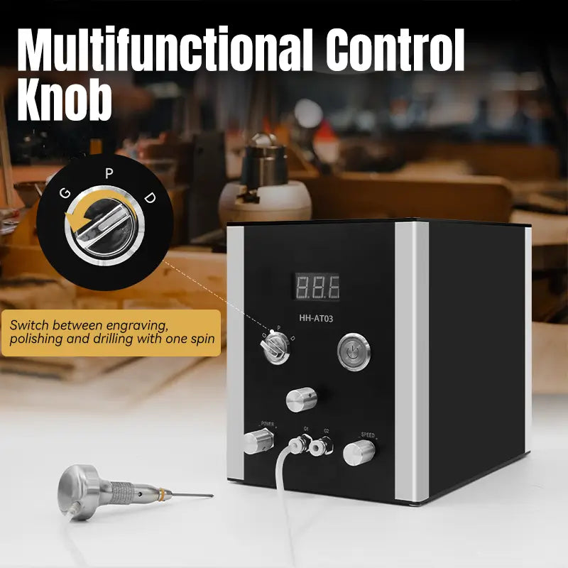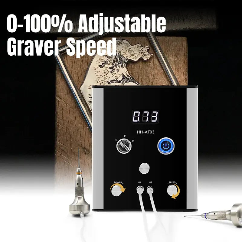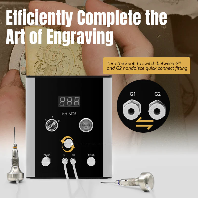 HH-AT03 pneumatic jewelry engraver special beyond the air compressor free feature.The double handpiece can be quickly modified by Handpiece Selector Knob to allow for a wide variety of engraving styles from light bulino work to heavy engraving in hard metals like steel and titanium.