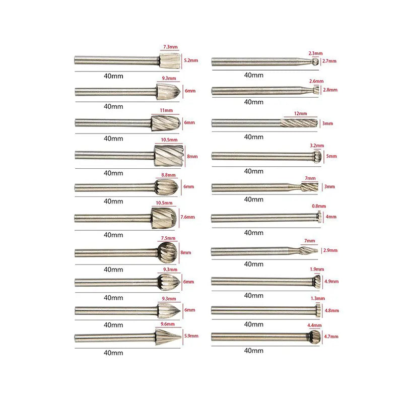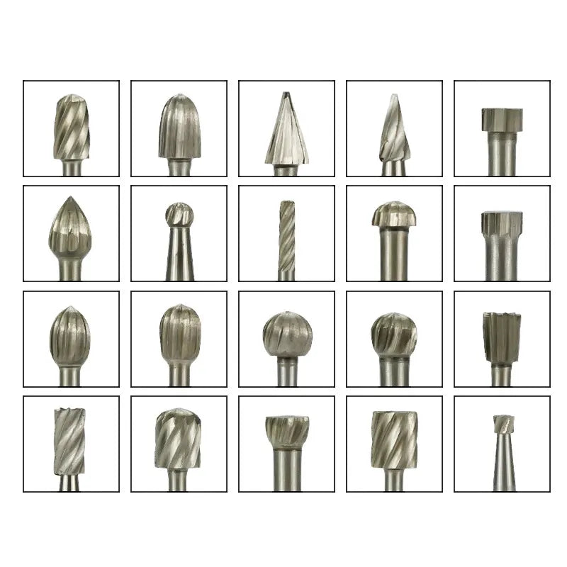 This set includes 20 pieces of solid carbide rotary burrs, providing a comprehensive selection for various tasks.