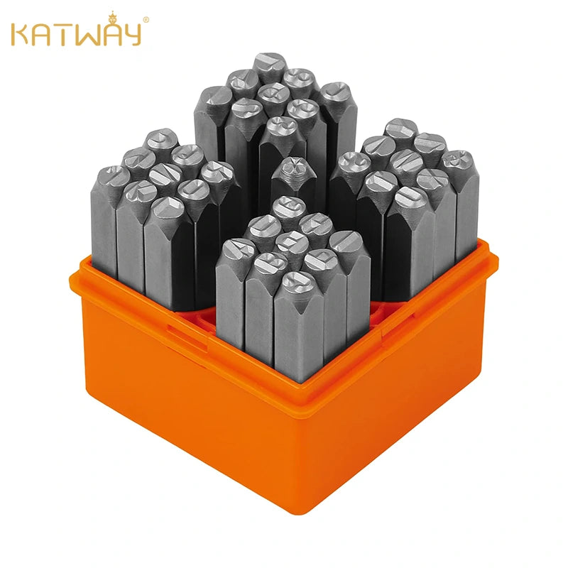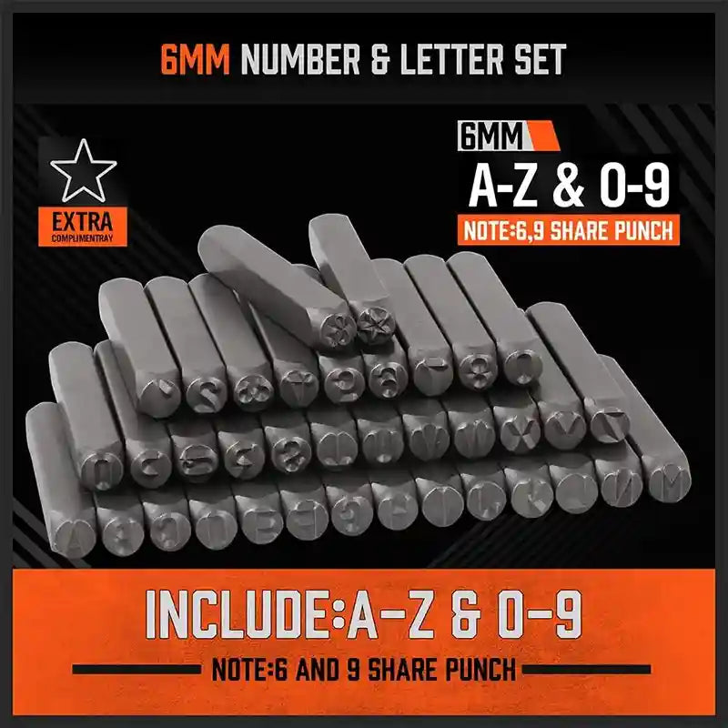 Compact and space-saving, the set includes 27 letter punches (A-Z), the “&” symbol, and 9 number punches (0-8, with the 6 doubling as a 9).