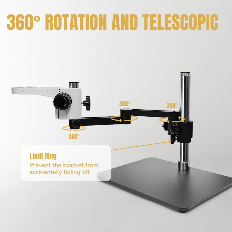 The stand is height adjustable with a working distance of 95-300 mm (3.74-11.81 inch), and the boom can move forward/backward to cover a large work area.