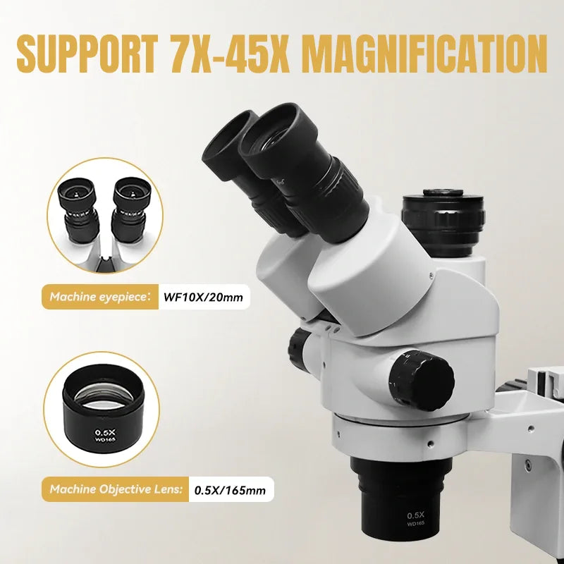 This microscope is designed with binocular stereo imaging technology, supporting 7X-45X continuous zoom and interpupillary distance adjustment.