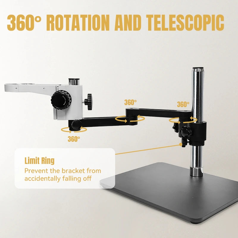 The stand is height adjustable with a working distance of 95-300 mm (3.74-11.81 inch), and the boom can move forward/backward to cover a large work area.