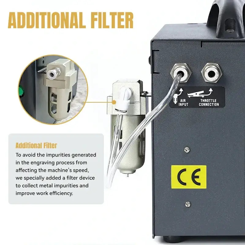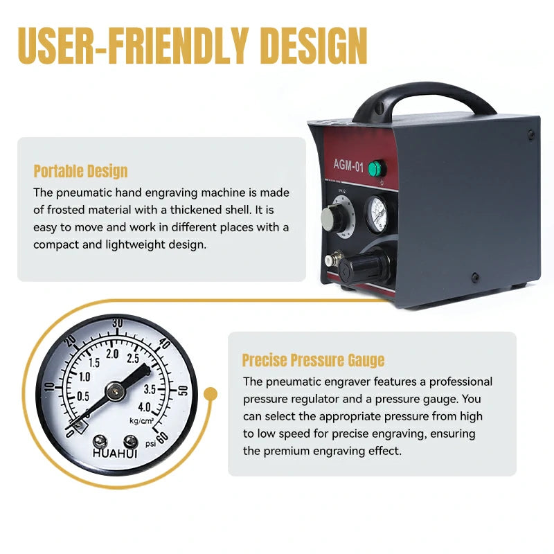 The pneumatic graver has full-featured clear buttons to achieve quick and easy operation. In addition,a reasonable layout with an intuitive and clear mechanical pointer improves daily use convenience.