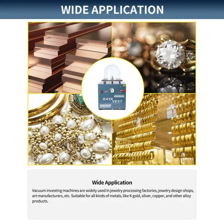 Vacuum Investing machines find extensive application across various sectors including jewelry processing factories, jewelry design shops, and art manufacturing units. They are adept in working with an array of metals such as K gold, silver, copper, and other alloy products. Specifically, these machines excel in creating intricate designs, prototypes, and small-scale production runs for a wide range of jewelry pieces including rings, pendants, earrings, and more.